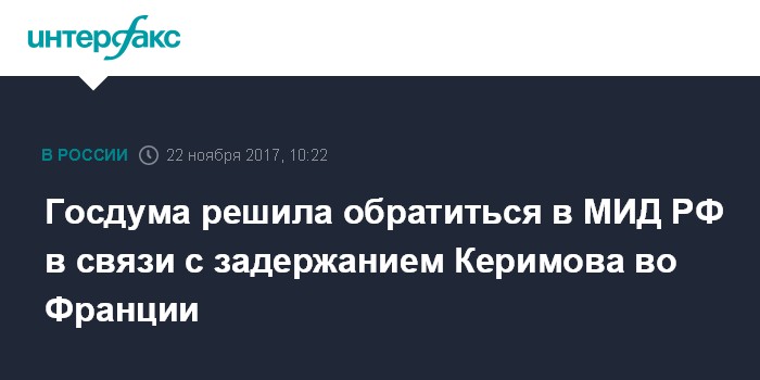 Москва. 22 ноября. INTERFAX.RU - Госдума в среду может обратиться к МИД России с просьбой выразить протест в связи с задержанием во Франции сенатора Сулеймана Керимова.