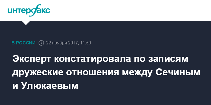 "На фонограммах представленных высказываний, которые бы показывали наличие между Сечиным и Улюкаевым конфликта или негативного окраса, нет. Здесь вербально выражено добродушное, дружеское, радостное отношение между ними", - сказала эксперт в среду в суде.