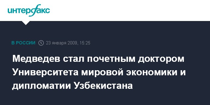 Москва. 23 января. INTERFAX.RU - Президент РФ Дмитрий Медведев стал обладателем звания почетного доктора Университета мировой экономики и дипломатии - одного из наиболее престижных вузов Узбекистана.
