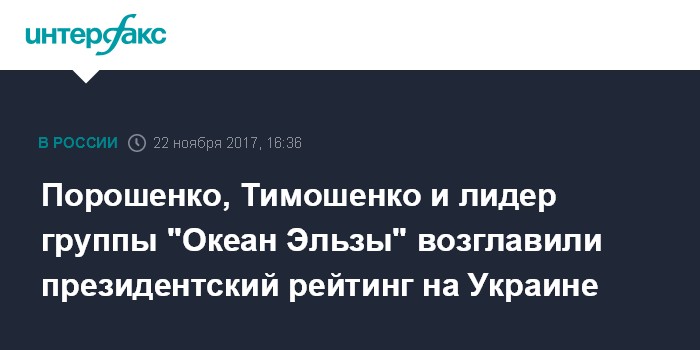 Москва. 22 ноября. INTERFAX.RU - Действующий президент Украины Петр Порошенко, лидер партии "Батькивщина" Юлия Тимошенко и лидер группы "Океан Эльзы" Святослав Вакарчук возглавляют рейтинг кандидатов на возможных президентских выборах.