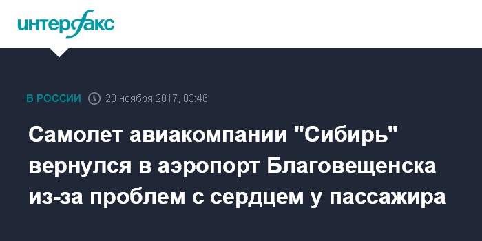 Москва. 23 ноября. INTERFAX.RU - Экипаж самолета авиакомпании "Сибирь", следовавший из Благовещенска в Новосибирск, принял решение вернуться в аэропорт вылета из-за проблем со здоровьем у одного из пассажиров, сообщила "Интерфаксу" специалист по связям с общественностью аэропорта Благовещенск Надежда Елисеева.