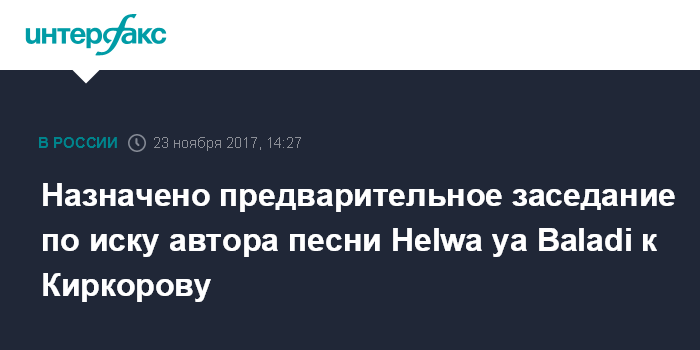 Москва. 23 ноября. INTERFAX.RU - Савеловский суд Москвы 18 января проведет предварительные слушания по иску Кассаба Самира Жильберта Синуэ, автора песни Helwa ya Baladi, написанной им для звезды французской эстрады Далиды, к российскому певцу Филиппу Киркорову.