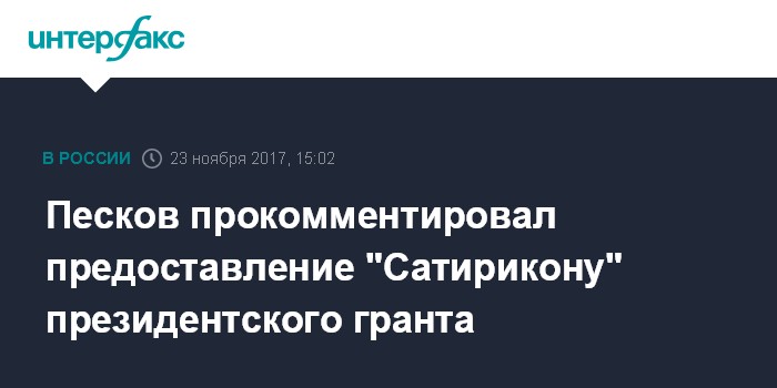 Москва. 23 ноября. INTERFAX.RU - Пресс-секретарь президента РФ Дмитрий Песков заявил, что предоставление "Сатирикону" президентского гранта не означает, что Кремль поддерживает худрука театра Константина Райкина в конфликте с Минкультуры.