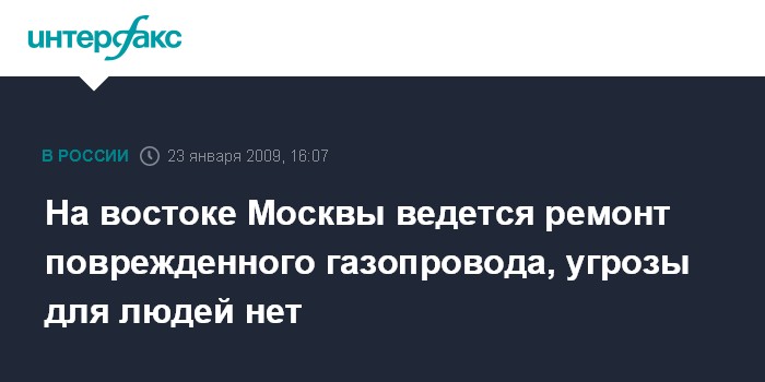 Москва. 23 января. INTERFAX.RU - На востоке Москвы начались ремонтно-восстановительные работы на месте аварии газопровода, сообщил "Интерфаксу" источник в комплексе городского хозяйства столицы в пятницу.