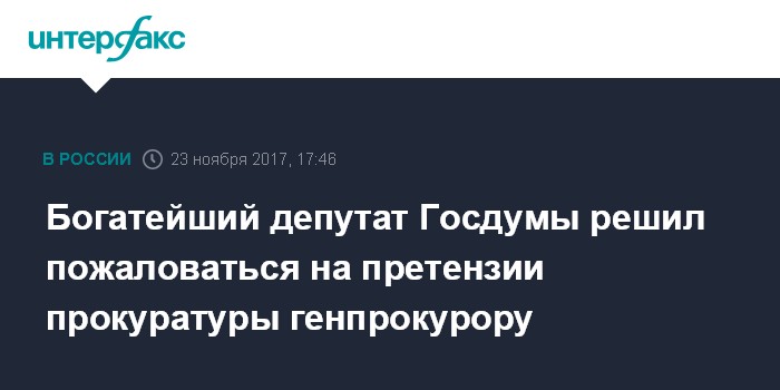 Богатейший депутат Госдумы решил пожаловаться на претензии прокуратуры генпрокурору