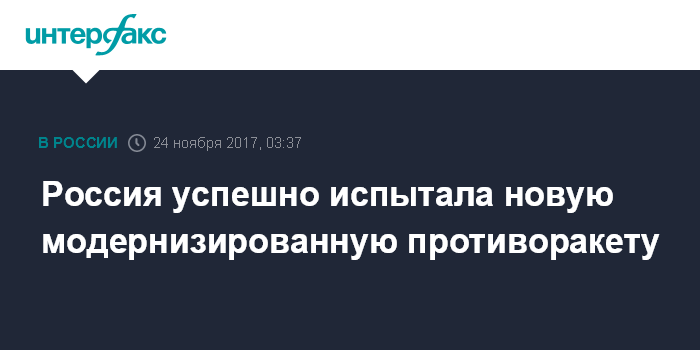 Москва. 24 ноября. INTERFAX.RU - Россия провела успешное испытание новой ракеты системы противоракетной обороны (ПРО), сообщили в Минобороны РФ.