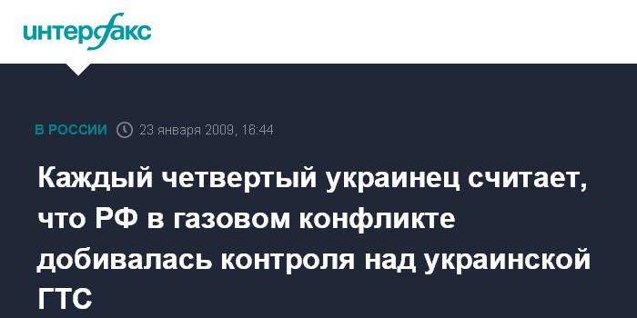 Москва. 23 января. INTERFAX.RU - Около четверти населения Украины считает, что Россия в газовом конфликте добивалась контроля над украинской газотранспортной системой. Об этом свидетельствуют данные социологического исследования, которое было проведено Национальным институтом стратегических исследований, презентованные на пресс-конференции в пятницу.