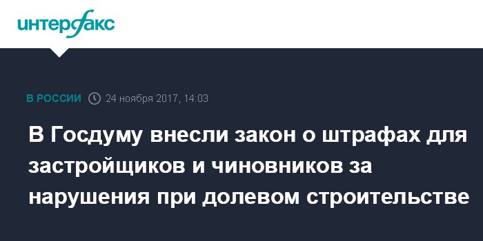 Москва. 24 ноября. INTERFAX.RU - Законопроект, вводящий в Кодекс об административных нарушениях (КоАП) штрафы за нарушения в сфере долевого строительства жилья, внесен в Госдуму РФ. Соответствующий документ размещен в электронной базе данных нижней палаты парламента.