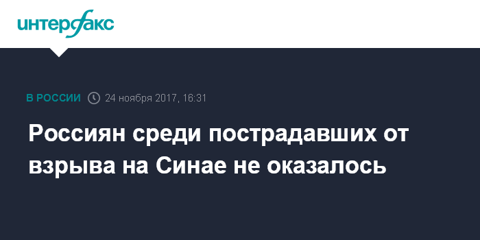 Москва. 24 ноября. INTERFAX.RU - По предварительным данным, среди пострадавших в результате атаки на мечеть на севере Синайского полуострова россиян нет, сообщили в посольстве России в Египте.