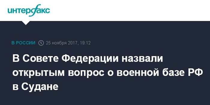 Москва. 25 ноября. INTERFAX.RU - Решения о военной базе РФ в Судане на данный момент нет, но даже если оно будет принято, это процесс не одного дня, он требует достаточного времени, заявил глава комитета Совета Федерации по обороне и безопасности Виктор Бондарев.