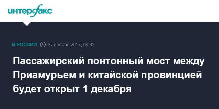 Москва. 27 ноября. INTERFAX.RU - Открытие понтонного моста Благовещенск (РФ) - Хэйхэ (КНР) через реку Амур в Амурской области намечено на начало декабря, сообщает в понедельник пресс-служба областного министерства внешнеэкономических связей, туризма и предпринимательства.