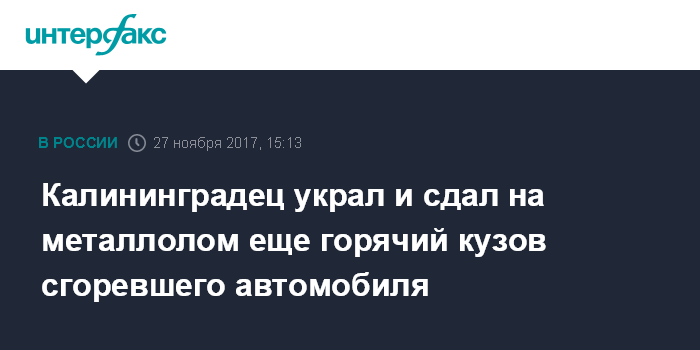 Москва. 27 ноября. INTERFAX.RU - Житель Калининграда сдал на металлолом еще не остывший после пожара кузов автомобиля, сообщили "Интерфаксу" пресс-службе регионального МВД.