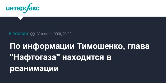 Киев. 23 января. ИНТЕРФАКС-УКРАИНА - Глава НАК "Нафтогаз Украины" Олег Дубина сейчас находится в реанимации, заявила премьер-министр Украины Юлия Тимошенко в эфире программы "Шустер Live" на телеканале "Украина" в пятницу вечером.