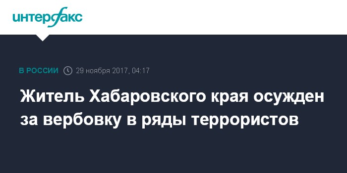 Москва. 29 ноября. INTERFAX.RU - Дальневосточный окружной военный суд вынес приговор жителю Хабаровского края, пытавшемуся уговорить знакомых уехать в Сирию и вступить в ряды террористов, сообщает пресс-служба УФСБ России по Хабаровскому краю.