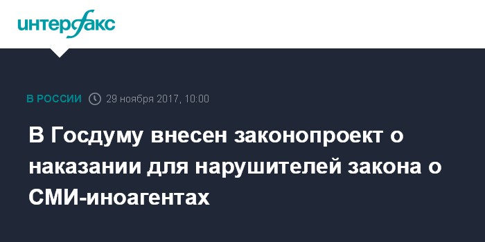 Москва. 29 ноября. INTERFAX.RU - В Госдуму внесен проект закона, предусматривающий административный штраф до 5 млн рублей за нарушение порядка деятельности иностранного СМИ, выполняющего функции иностранного агента.