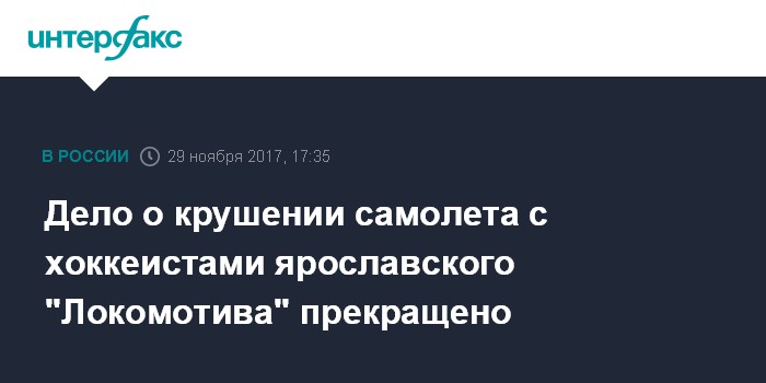 Москва. 29 ноября. INTERFAX.RU - Главное следственное управление СКР прекратило расследование уголовного дела о катастрофе самолета с хоккеистами ярославского "Локомотива" в аэропорту "Туношна". Об этом сообщил "Интерфаксу" адвокат потерпевших Александр Захарьин.