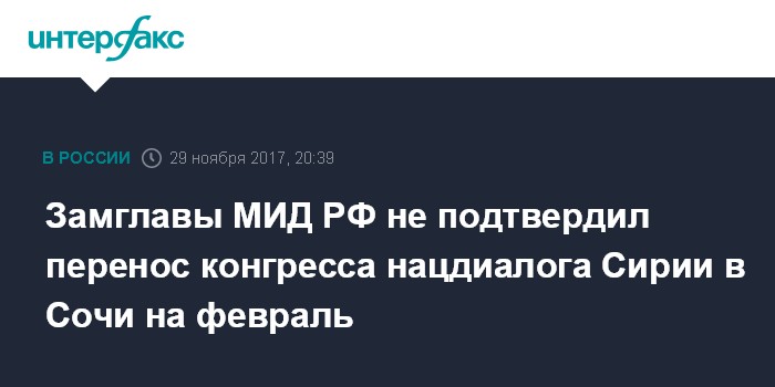 Ранее в СМИ появилась информация о том, что конгресс национального диалога Сирии в Сочи может пройти в феврале 2018 года.
