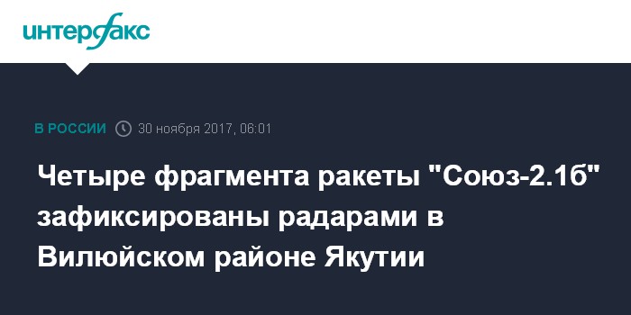 Четыре фрагмента ракеты "Союз-2.1б" зафиксированы радарами в Вилюйском районе Якутии