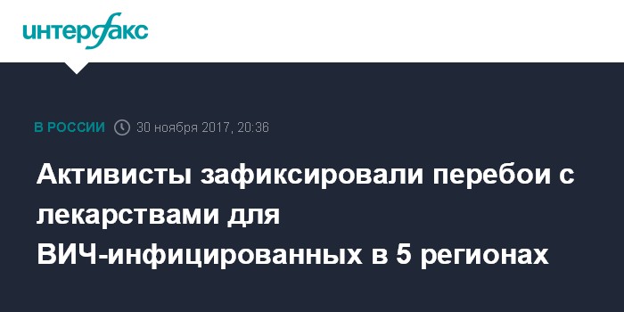 Москва. 30 ноября. INTERFAX.RU - Перебои и недостаток лекарств для терапии ВИЧ-инфицированных пациентов особенно остро ощущались в 2017 году в Алтайском крае, Волгоградской и Новосибирской областях, а также в Свердловской области и Москве, сообщила консультант сайта общественного движения "Пациентский контроль" Юлия Верещагина.