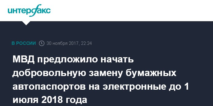 Москва. 30 ноября. INTERFAX.RU - МВД предлагает предоставить водителям возможность менять бумажные паспорта автомобилей на электронные по желанию до 1 июля 2018 года, сообщила "Интерфаксу" в четверг официальный представитель ведомства Ирина Волк.