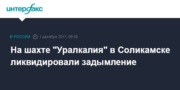 Информация о задымлении в старой выработке шахты по добыче калийной соли в Соликамске поступила в 7:55 по местному времени (5:55 по Москве). Инцидент произошел на руднике "Соликамск-1", уточнили в "Уралкалии".