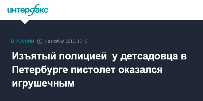 Москва. 1 декабря. INTERFAX.RU - Пистолет, изъятый полицейскими у воспитанника детского сада в Петербурге, оказался игрушкой, сообщили в пятницу в пресс-службе местного уполномоченного по правам ребенка.