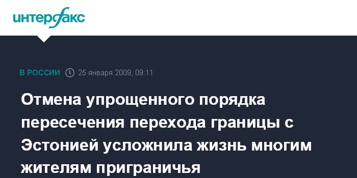 Эстонско-российский договор о льготном визовом режиме для жителей приграничных регионов прекратил свое действие 19 января в соответствии с правилами Евросоюза и требованиями Шенгенской зоны. До этого времени согласно договоренности между Эстонией и Россией правом на облегченный переход границы пользовались лица, у которых есть недвижимость на сопредельной стороне, проживают или похоронены родственники. Местные власти ежегодно составляли и обновляли списки людей, имеющих право на эту льготу.