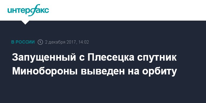 Москва. 2 декабря. INTERFAX.RU - Ракета-носитель "Союз-2.1б", стартовавшая в субботу с Плесецка, успешно вывела на орбиту спутник Минобороны, сообщили журналистам в пресс-службе военного ведомства.