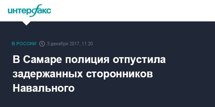 Москва. 3 декабря. INTERFAX.RU - Полиция отпустила сторонников Алексея Навального, задержанных минувшей ночью в Самаре при монтаже сцены для предстоящего митинга, сообщила координатор регионального штаба Екатерина Герасимова.
