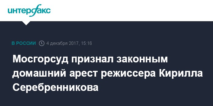 Москва. 4 декабря. INTERFAX.RU - Мосгорсуд признал законным продление домашнего ареста художественного руководителя "Гоголь-центра", режиссера Кирилла Серебренникова, обвиняемого в хищении бюджетных 68 млн рублей, передает корреспондент "Интерфакса".