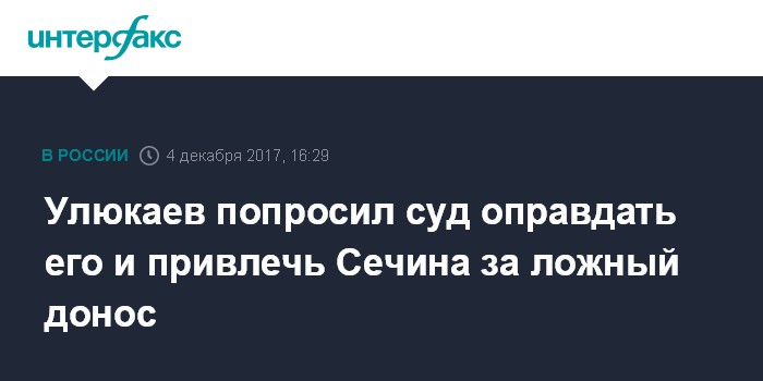 Москва. 4 декабря. INTERFAX.RU - Бывший министр экономического развития Алексей Улюкаев потребовал от судьи Ларисы Семёновой направить в следственный комитет РФ материал о проверке главы "Роснефти" Игоря Сечина о привлечении его за ложный донос.