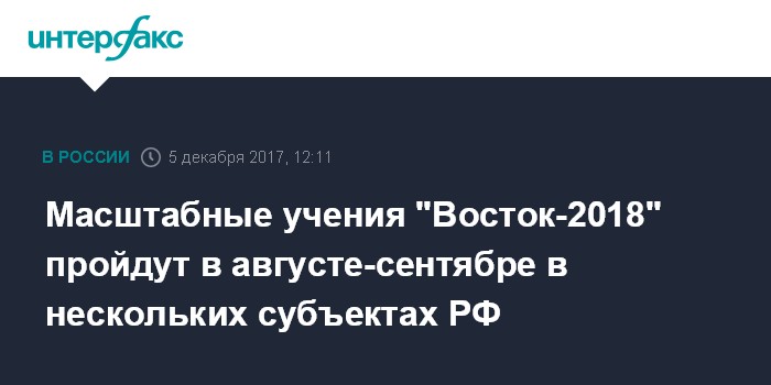 "Крупнейшим мероприятием боевой учебы следующего года станут учения "Восток-2018", которые пройдут в августе-сентябре на территории Сибири и Дальнего Востока. Планируется задействовать силы и средства Восточного и Центрального военных округов, Северного флота", - сказал министр на селекторном совещании во вторник.