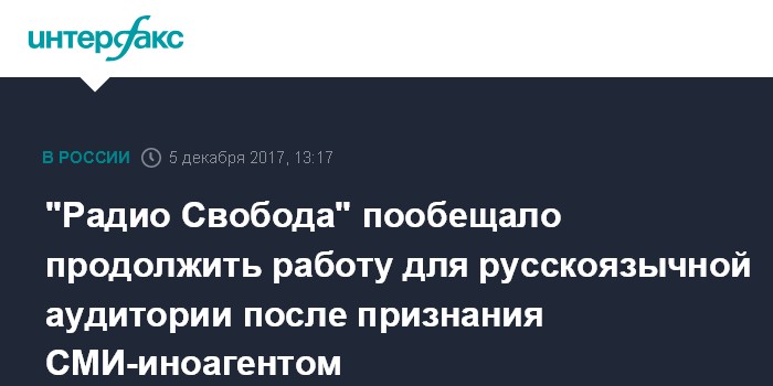 Москва. 5 декабря. INTERFAX.RU - Президент "Радио Свободная Европа/Радио Свобода" Том Кент заявил, что, несмотря на включение проектов корпорации в список СМИ - иностранных агентов в России, они продолжат журналистскую работу в интересах русскоязычной аудитории.