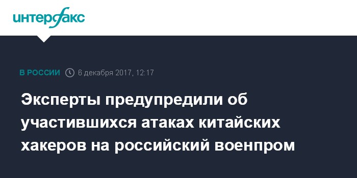 Москва. 6 декабря. INTERFAX.RU - Китайские кибергруппировки в 2017 году активно атаковали российские госструктуры и военную промышленность, заявил главный антивирусный эксперт "Лаборатории Касперского" Александр Гостев журналистам в среду.