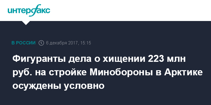 Москва. 6 декабря. INTERFAX.RU - Два фигуранта уголовного дела о хищении 223 млн рублей, выделенных на строительство военных объектов в Арктике, приговорены в Петербурге к двум годам колонии условно каждый, сообщает объединенная пресс-служба судов города в среду.