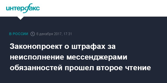 Москва. 6 декабря. INTERFAX.RU - Госдума в среду приняла во втором чтении законопроект об административных штрафах за несоблюдение обязанностей, прописанных в законодательстве, регулирующем работу мессенджеров.
