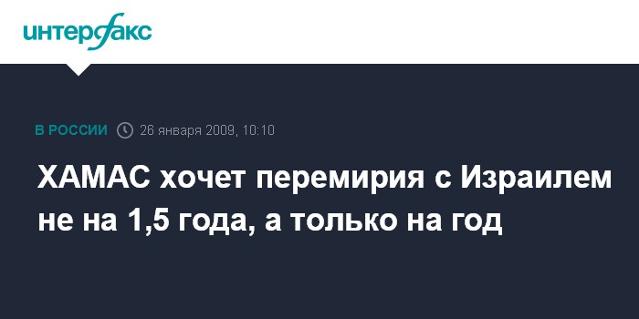 "ХАМАС выслушала израильское предложение (министра обороны Израиля) Амоса Гилада о перемирии сроком на полтора года, но ХАМАС представляет встречное предложение о заключении перемирия только на один год", - сказал представитель исламской группировки Айман Таха.