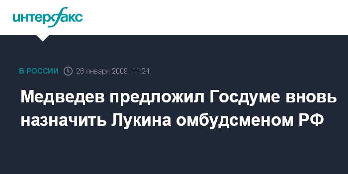Москва. 26 января. INTERFAX.RU - Президент России Дмитрий Медведев внес в Госдуму предложение о назначении Владимира Лукина на должность Уполномоченного по правам человека в РФ, сообщает в понедельник пресс-служба Кремля.