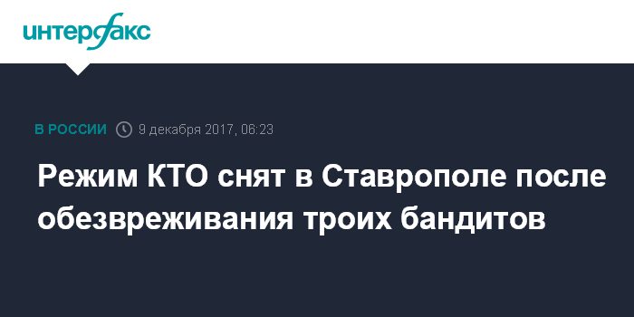 Москва. 9 декабря. INTERFAX.RU - Режим контртеррористической операции (КТО) снят в Ставрополе спустя четыре часа, после его объявления, сообщает пресс-служба регионального управления ФСБ региона.