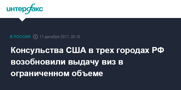 Москва. 11 декабря. INTERFAX.RU - Консульства США в Санкт-Петербурге, Екатеринбурге и Владивостоке с понедельника возобновят проведение собеседований на неиммиграционные визы российским гражданам в ограниченном объеме.
