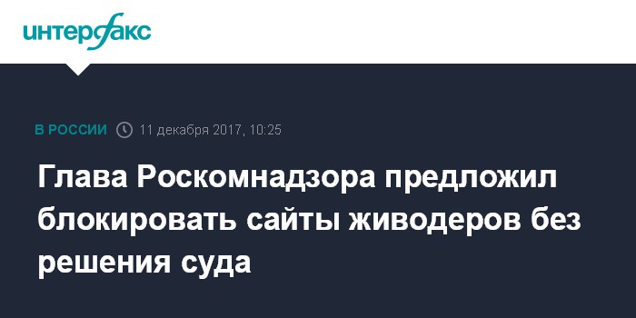 Москва. 11 декабря. INTERFAX.RU - Глава Роскомнадзора Александр Жаров сообщил, что намерен инициировать обсуждение поправок в законодательство, позволяющих блокировать сайты с живодерским контентом внесудебными мерами.