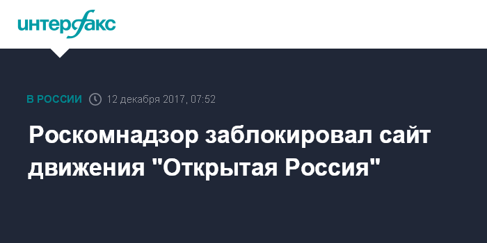 "Сайт Открытой России начали блокировать на территории России. Страница не открывается через большинство провайдеров", - сказали "Интерфаксу" в пресс-службе. В реестре Федеральной службы по надзору в сфере связи, информационных технологий и массовых коммуникаций (Роскомнадзор) отмечается, что доступ к сайту ограничивается на основании решения Генпрокуратуры 27-31-2017/Ид6629-17 от 11 декабря.