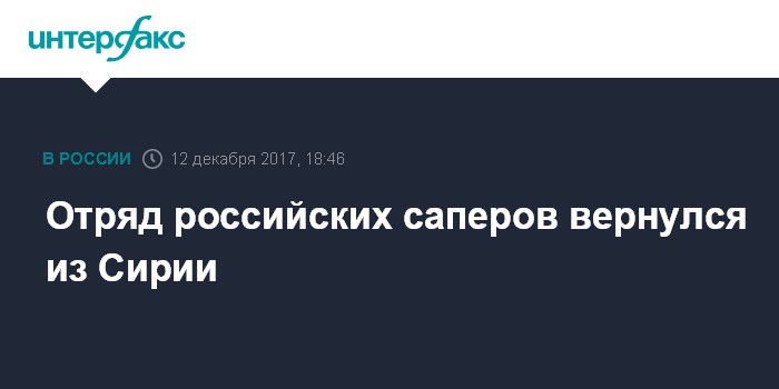 Москва. 12 декабря. INTERFAX.RU - Отряд российских саперов во вторник вернулся из Сирии, сообщили в департаменте информации Минобороны РФ.