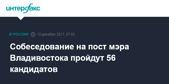 Москва. 13 декабря. INTERFAX.RU - Все 56 кандидатов на должность мэра Владивостока прошли первый этап конкурса, в ходе которого проверялись представленные документы.