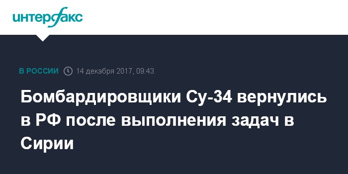 Москва. 14 декабря. INTERFAX.RU - Фронтовые бомбардировщики Су-34 вернулись из Сирии в Россию, сообщили в четверг в Минобороны РФ.