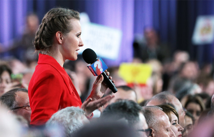 Ксения Собчак задает свой вопрос. Ее волнует конкуренция на выборах и проблемы, с которыми сталкиваются оппозиционные кандидаты. В пример приводит Алексея Навального, который является фигурантом уголовных дел и не допускается к выборам. И сама Собчак сталкивается с тем, что сложно снять зал под мероприятие. Почему так происходит, интересуется она, неужали власть боится?