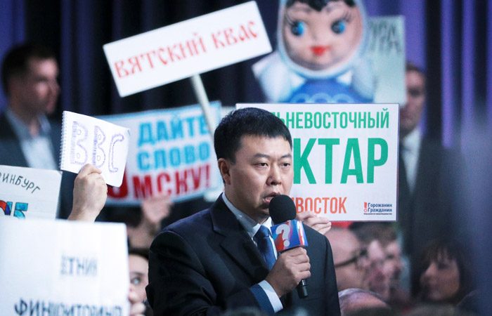 Президент заметил на плакате девушки в зале "Путин бай-бай" и захотел объединить вопросы, но "бай-бай" на самом деле оказался "бабаем" - то есть дедушкой по-татарски, и вопрос у журналистки был о языке и регионах. Не стоит ли планов по укрупнению регионов? По словам Путина, главное - создать равные условия для стартовой жизни детей из разных регионов и разных национальностей. Укрупнения регионов не будет, так как это опасно для единства РФ - каждый народ должен сам выбирать формы слияния.