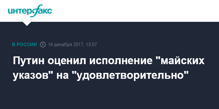 Москва. 14 декабря. INTERFAX.RU - Президент РФ Владимир Путин поставил оценку "удовлетворительно" исполнению своих "майских указов" 2012 года.