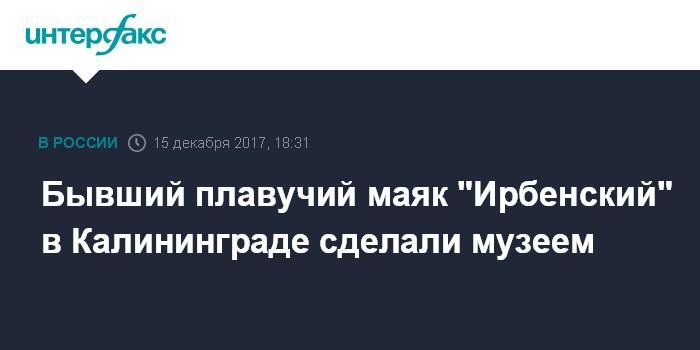 Москва. 15 декабря. INTERFAX.RU - В Калининграде бывший плавучий маяк Балтийского флота "Ирбенский" официально стал кораблем-музеем, сообщил "Интерфаксу" заместитель директора Калининградского музея Мирового океана Алексей Буданов.
