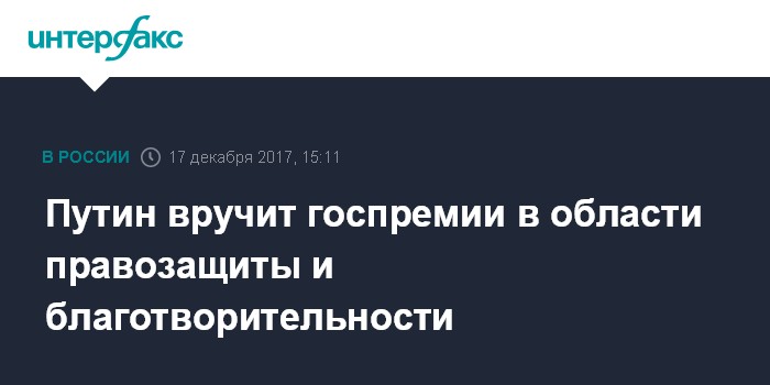 Москва. 17 декабря. INTERFAX.RU - Президент России Владимир Путин 18 декабря вручит в Кремле государственные премии за выдающиеся достижения в области правозащитной и благотворительной деятельности лауреатам 2017 года, сообщила в воскресенье пресс-служба Кремля.